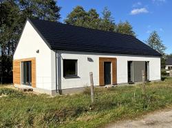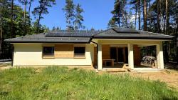 I. Termin realizacji: 2022 / 2023 r. II. Lokalizacja: Marynin (woj. mazowieckie). III. Projekt: indywidualny (Szreder A.C.; 2021 r.). IV. Powierzchnia: 109,21 m2. V. Układ funkcjonalny: cztery pokoje (12,84 m2, 12,08 m2, 12,04 m2 oraz 8,07 m2), salon połączony z kuchnią (31,20 m2 + 7,87 m2), dwie łazienki (6,12 m2 oraz 2,59 m2), hol (6,97 m2), pomieszczenie techniczne (4,38 m2), wiatrołap (5,05 m2). VI. Standard energetyczny: łączony, PLATINUM (ściany; wsp. U=0,13 W/m2*K) + DIAMOND (dach; wsp. U=0,08 W/m2*K). VII. Fundament: płyta fundamentowa z ogrzewaniem podłogowym. VIII. Instalacje: glikolowy gruntowy wymiennik ciepła, wentylacja mechaniczna z odzyskiem ciepła (rekuperator Thessla Green AirPack4 400v), c.w.u. (podgrzewacz wody Ariston Velis WIFI), elektryczna. IX. Inne elementy składowe domu: ostateczne pokrycie dachowe (dachówka ceramiczna płaska Koramic Orea 9), okna (Budvar Centrum, T-Energy), drzwi zewnętrzne (Vikking, Arctic Plus, Diplomat A6), elewacja (tynki Baumit, deski elewacyjne z modrzewia syberyjskiego).